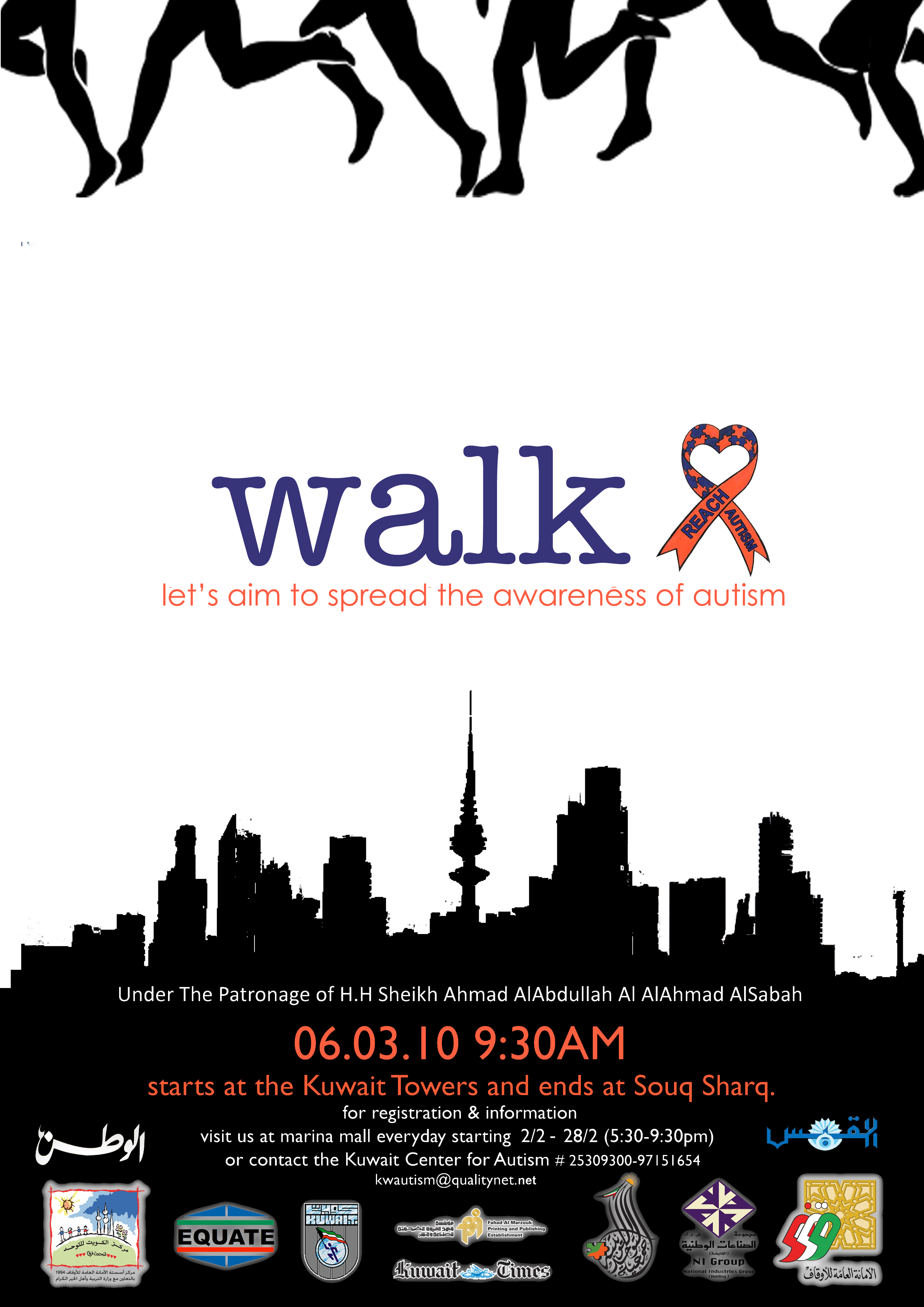 Kuwait Walk : Spreading Awareness about Autism 6/2/2010 Forzaq8 Leave a comment Registering is open at Marina Mall till 28th of February The Walk is going to be from Kuwait towers to Souq Sharq For more information check the banners